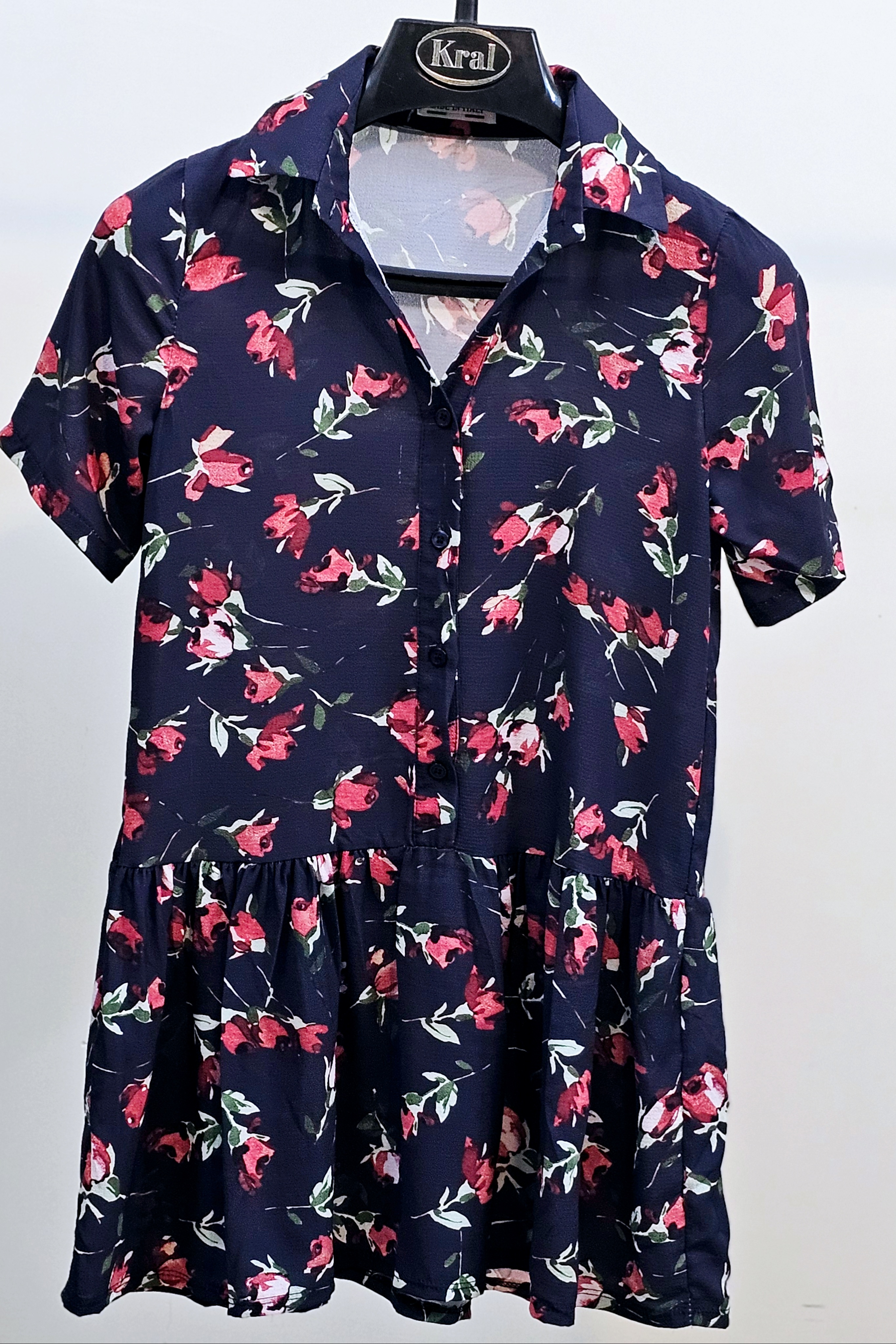 پیراهن زنانه زمینه سورمه‌ای طرح گلدار جنس کرپ سبک وراحت استوک یک تومن خرید کن ارسالت رو رایگان کن