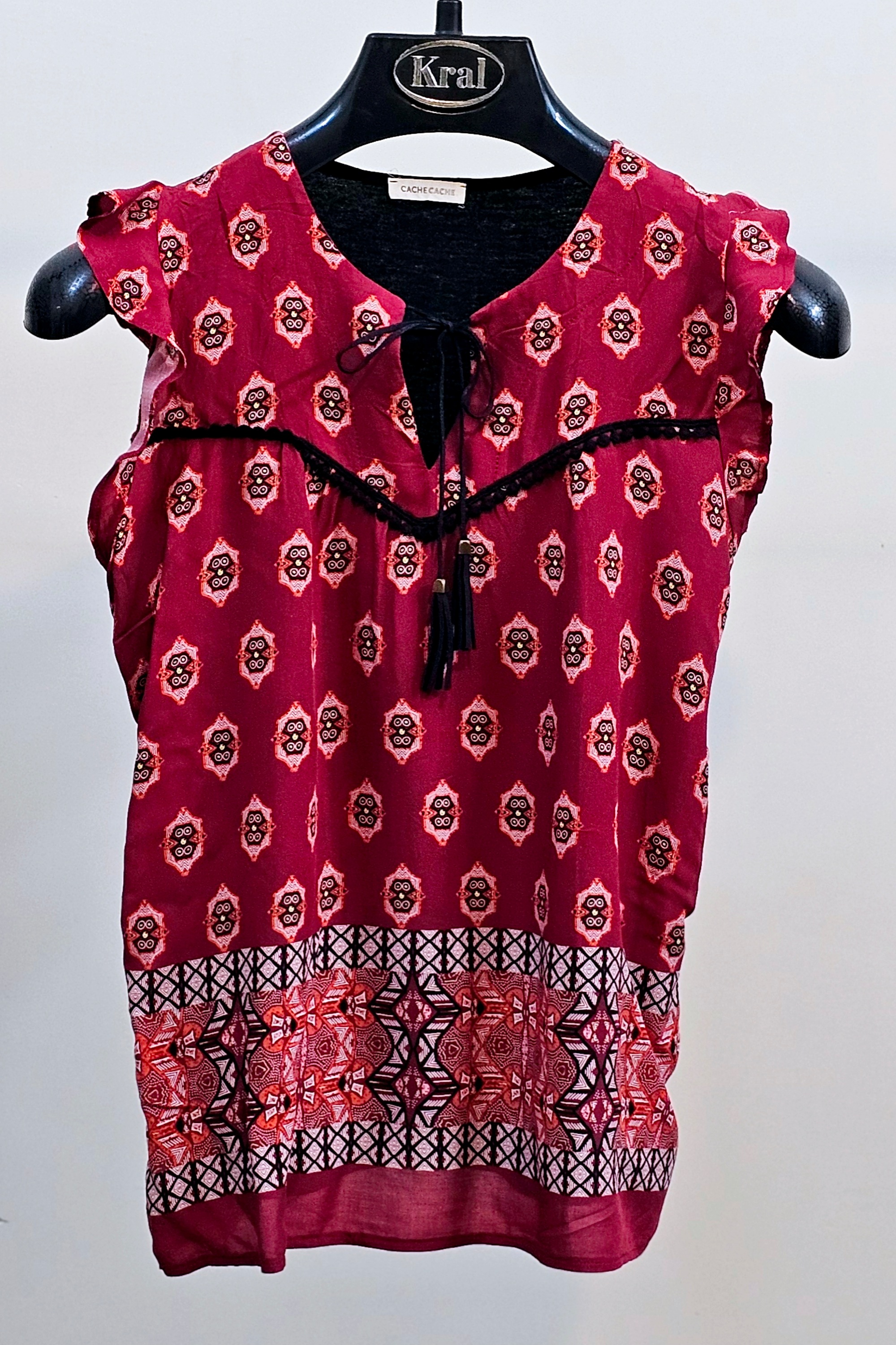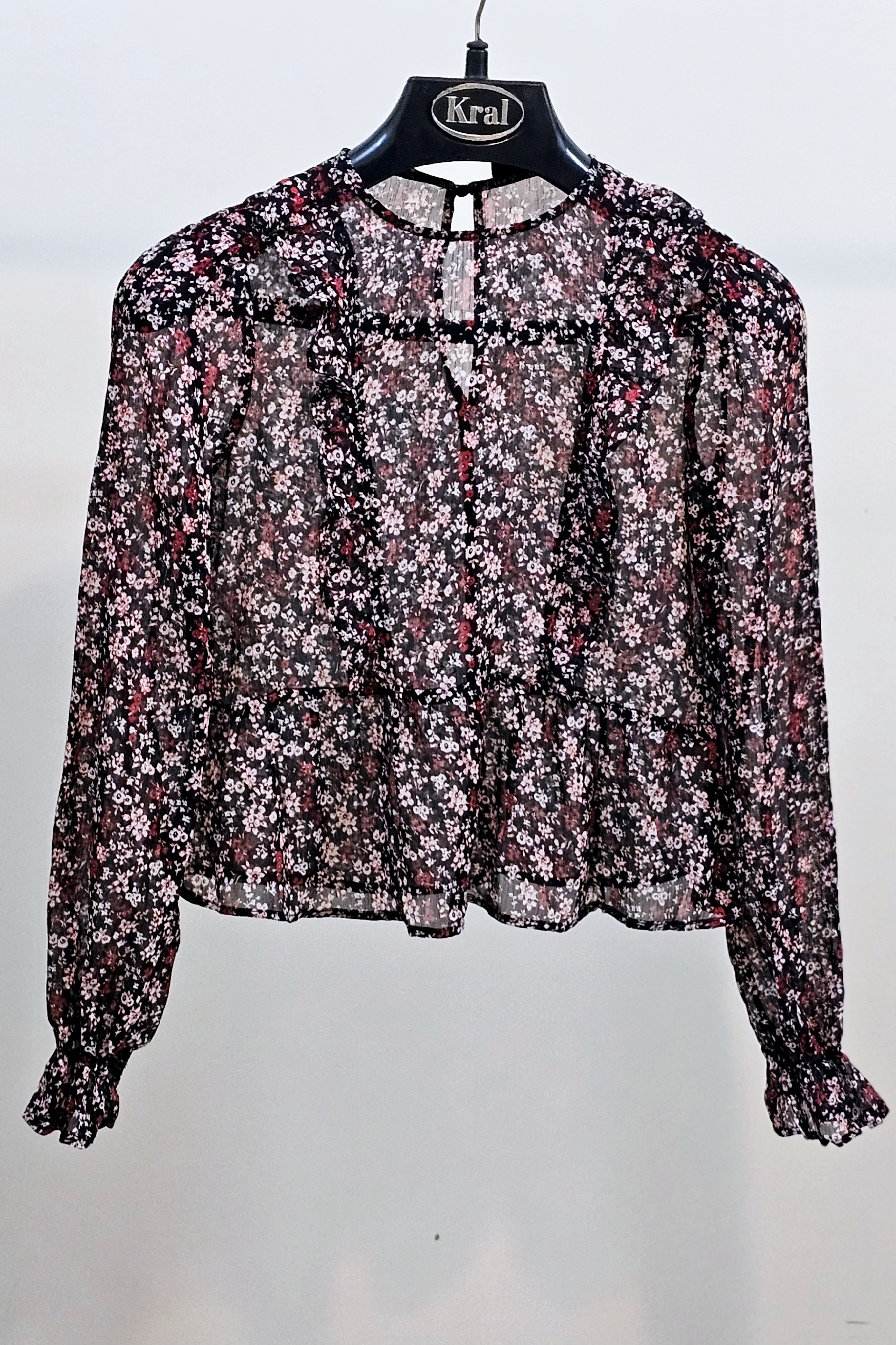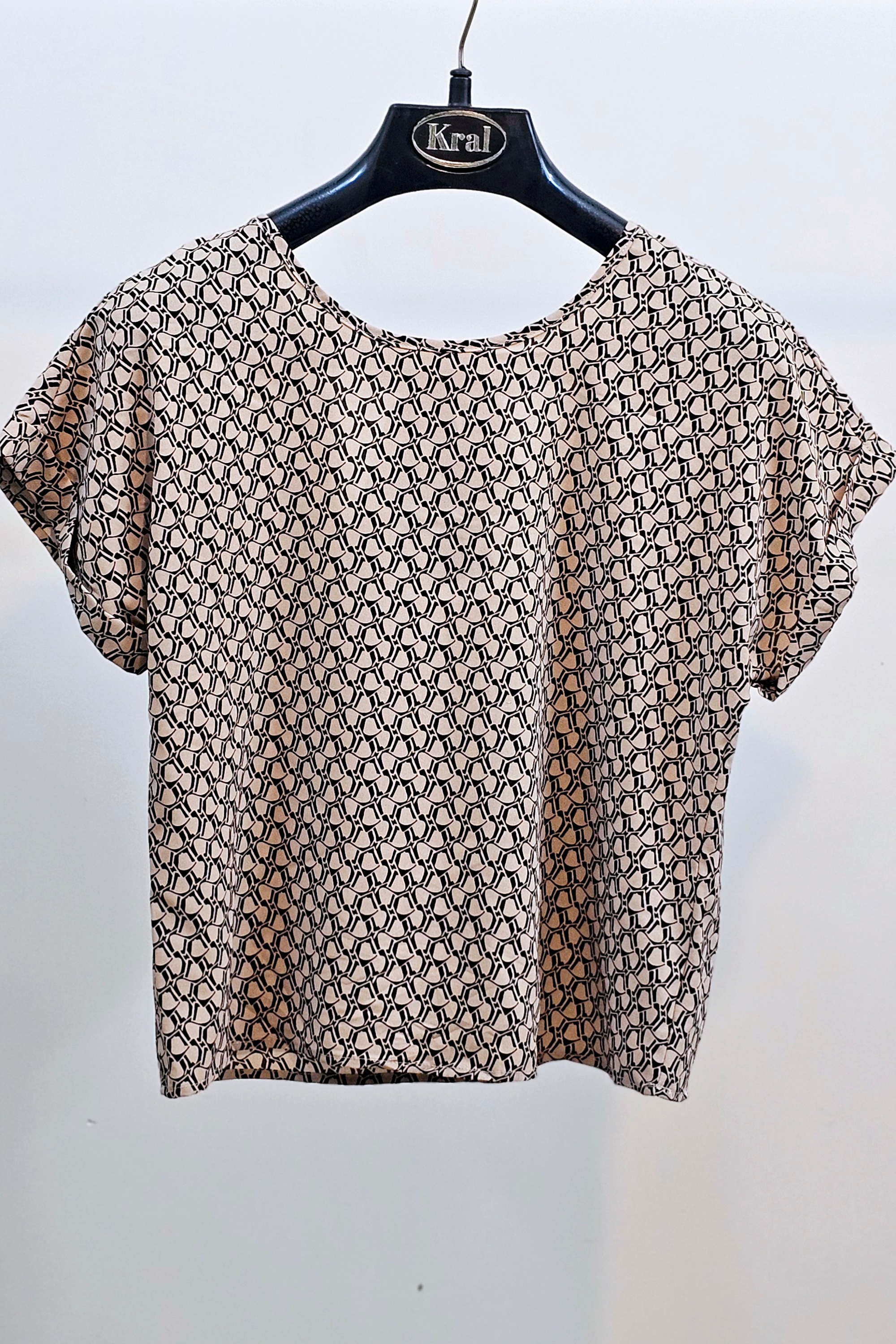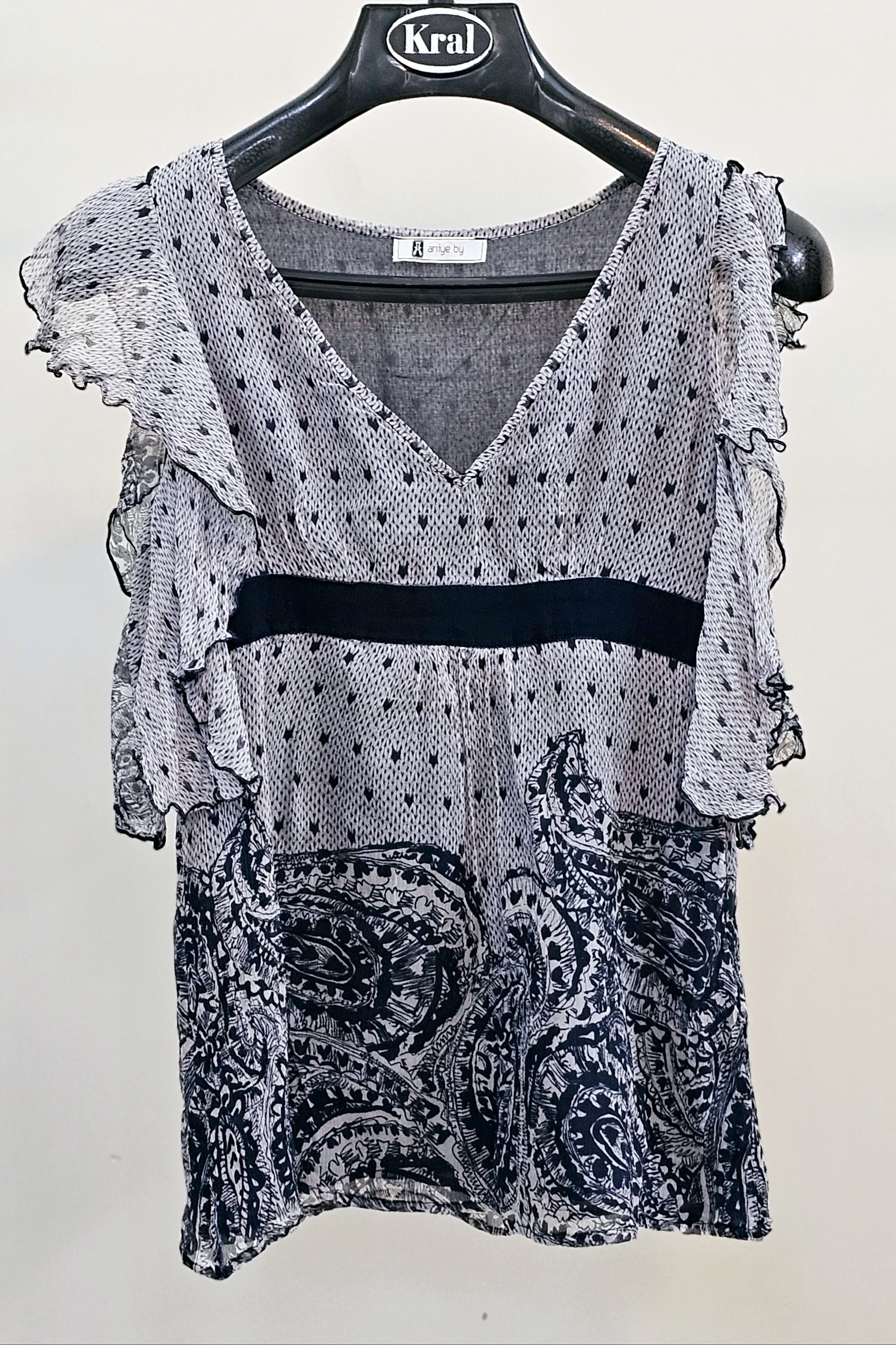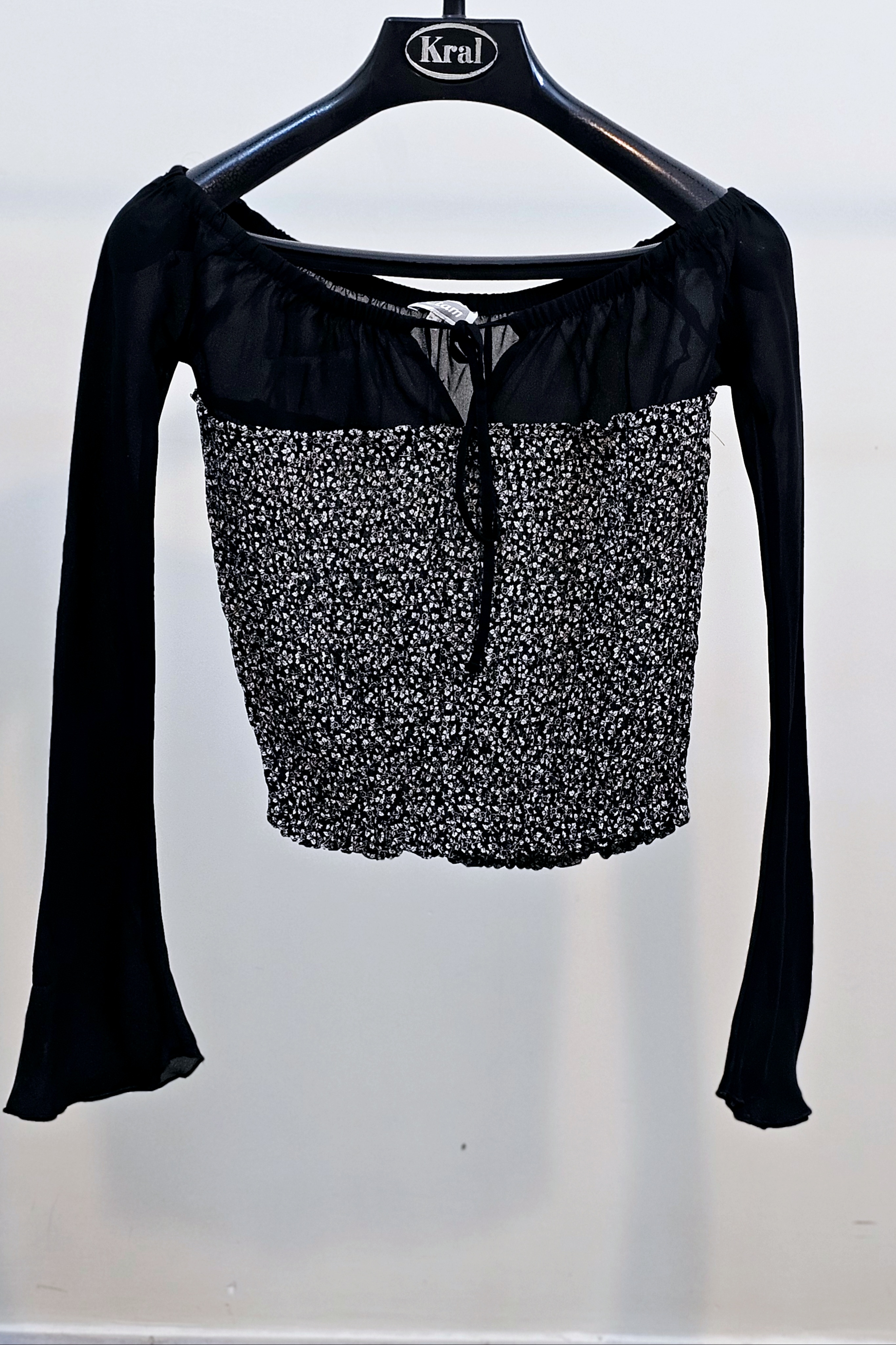تاپ زنانه کر حریر زمینه مشکی یقه فرنچ حلقه آستین